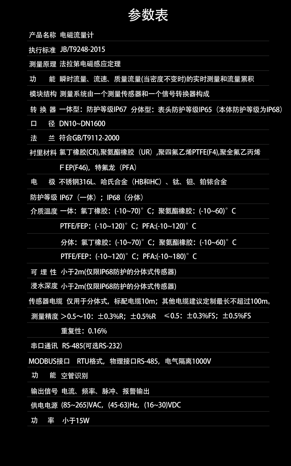 防護等級:一體型防護等級IP67;分體型表頭防護等級IP65(本體防護等級為IP68)