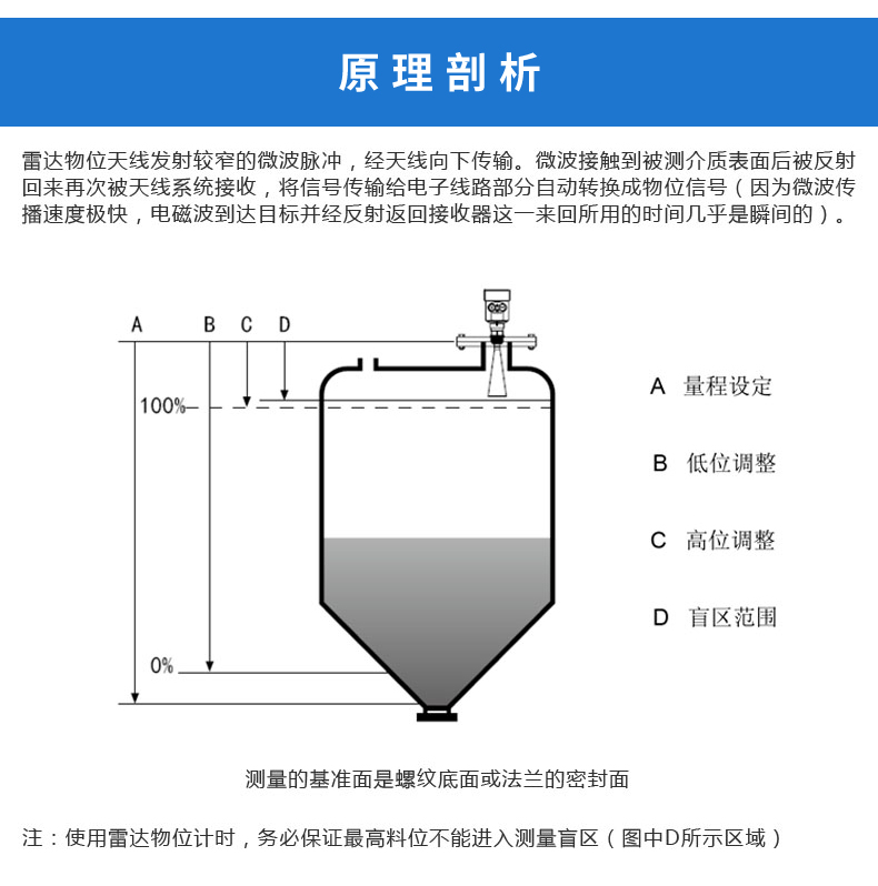 雷達液位計天線發射及窄的微波脈沖,這個脈沖以光速在空間傳播,遇到被測介質表面,其部分能量被反射回來,被同一天線接收。發射脈沖與接收脈沖的時間間隔與天線到被測介質表面的距離成正比,多用于水位、料位與化工場合。