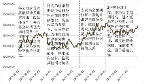 2017年鋼材期貨總體寬幅震蕩,重心上抬。2017年螺紋鋼期貨指數(shù)年內(nèi)高點4172點,最低2780點。