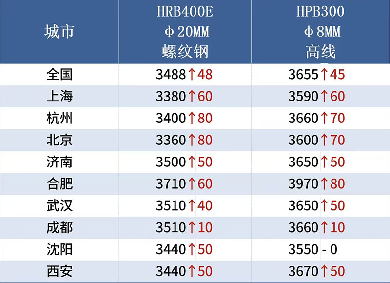 截至2月21日,全國主要城市20mm三級抗震螺紋鋼均價3490元/噸,周環(huán)比上漲50元/噸;8.0mmHPB300高線均價3660元/噸,周環(huán)比上漲50元/噸。