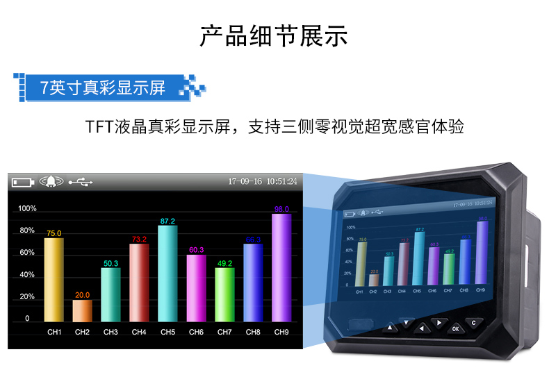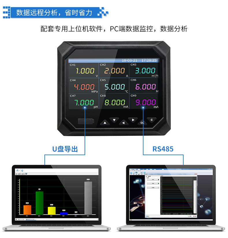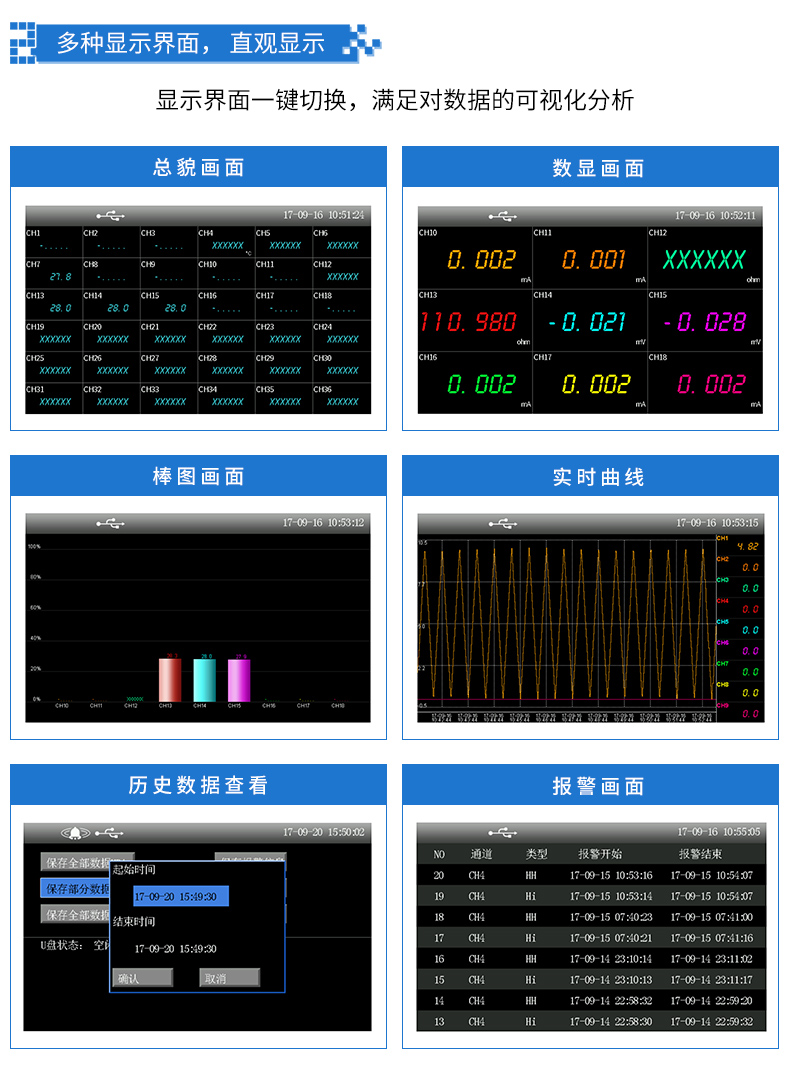 無紙記錄儀是將采集的數(shù)據(jù)/運算數(shù)據(jù)以時間為基軸記錄在儀器內(nèi)部的存儲系統(tǒng)中,無消耗任何常用的記錄設(shè)施,如:紙張、筆墨。記錄在儀器內(nèi)部的存儲數(shù)據(jù),通過運算、模擬后顯示在液晶屏。常用顯示用液晶屏比較廣泛。在液晶屏屏幕上,可以顯示數(shù)字顯示、棒圖顯示、曲線顯示、報警列表等。無紙記錄儀采集的數(shù)據(jù),常用的有:溫度、壓力、流量、液位、電壓、電流、濕度、頻率、振動、轉(zhuǎn)速等。