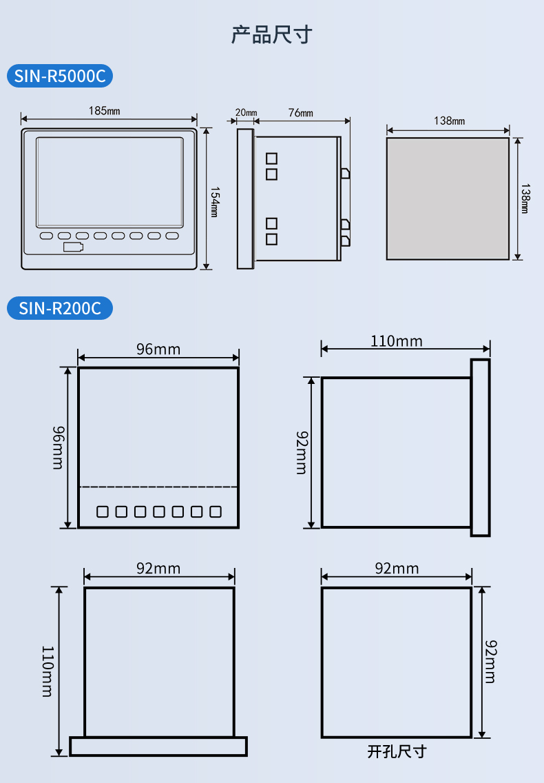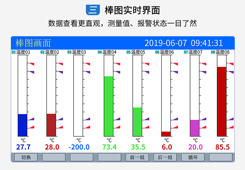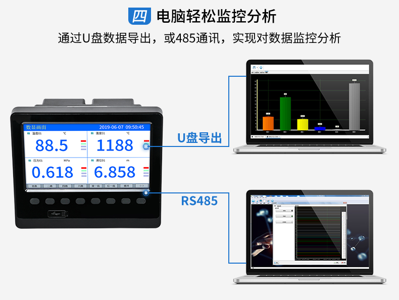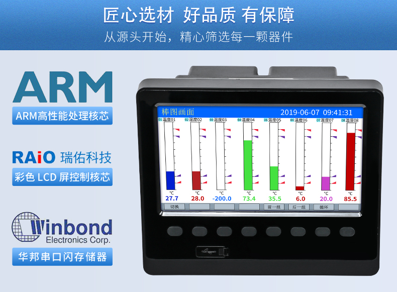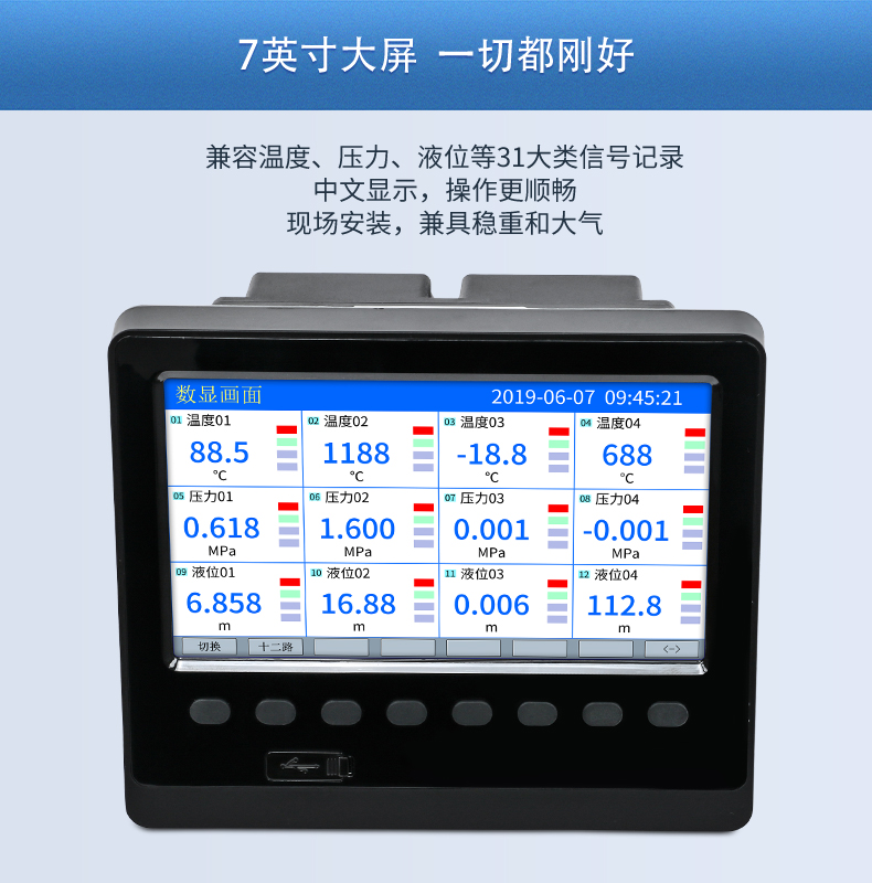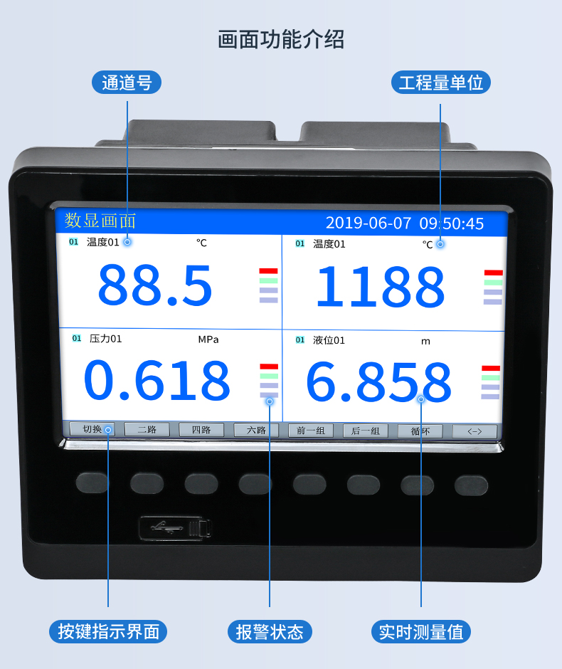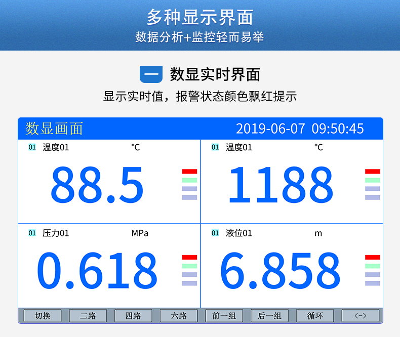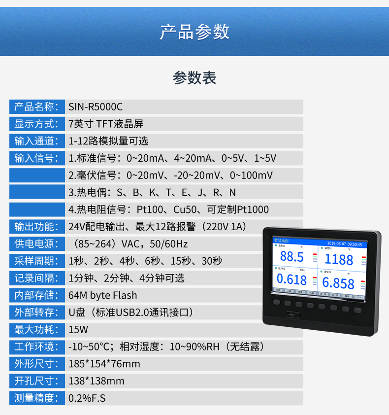 SIN-R5000C無紙記錄儀 12 路萬能輸入(可組態(tài)選擇輸入:標(biāo)準(zhǔn)電壓、標(biāo)準(zhǔn)電流、熱電偶、熱電阻、毫伏等)。可帶 12 路報警輸出或 6 路模擬量變送輸出,RS485 通訊接口,以太網(wǎng)接口,微型打印機(jī)接口和 USB 接口,SD 卡插座;可提供傳感器配電;具有強(qiáng)大的顯示功能,實時曲線顯示,歷史曲線追憶,棒圖顯示,報警列表顯示等。人性化的外觀設(shè)計、完美的功能體現(xiàn)、可靠的硬件品質(zhì)、精湛的制造工藝,使儀表具有更高的性能價格比。