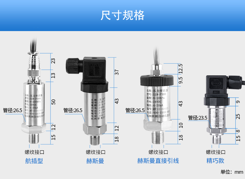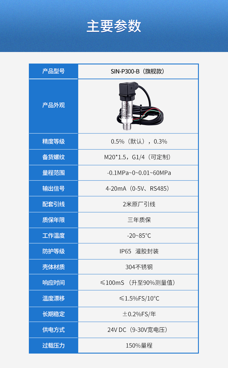 SIN-P300通用型壓力變送器德國進口硅芯片,精度高性能穩定;SIN-P300型通用型壓力變送器采用擴散硅壓力芯體作為敏感元件,內置處理電路將傳感器毫伏信號轉換成標準電壓﹑電流信號輸出,可直接與計算機、控制儀表﹑顯示儀表等相連。
