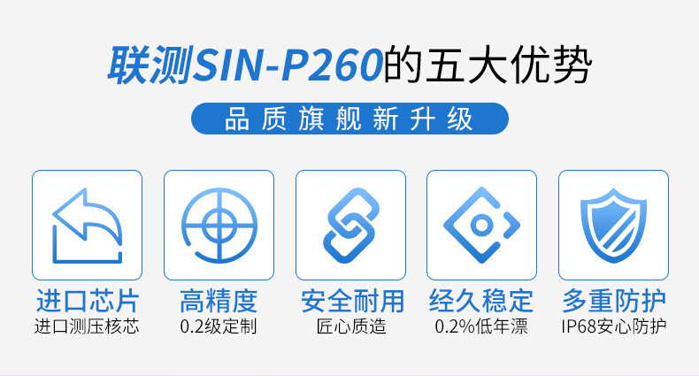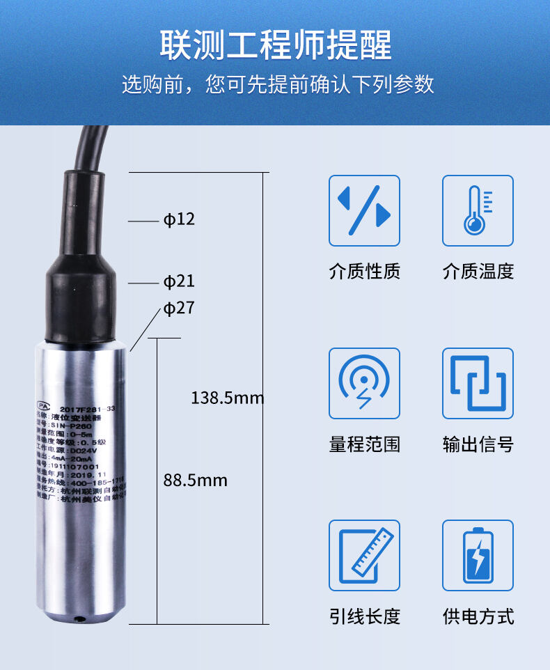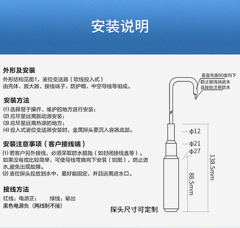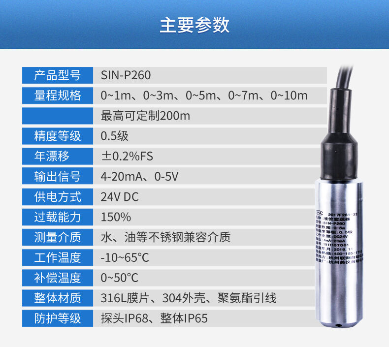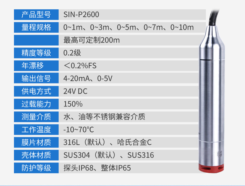 SIN-P260/P2600投入式液位變送器由高性能擴散硅壓阻式壓力傳感器作為測量元件,把與液位深度成正比的液體靜壓力準確測量出來,并經(jīng)過信號調(diào)理電路轉換成標準(電流或電壓)信號輸出,建立起輸出信號與液體深度的線性對應關系,實現(xiàn)對液體深度的測量。