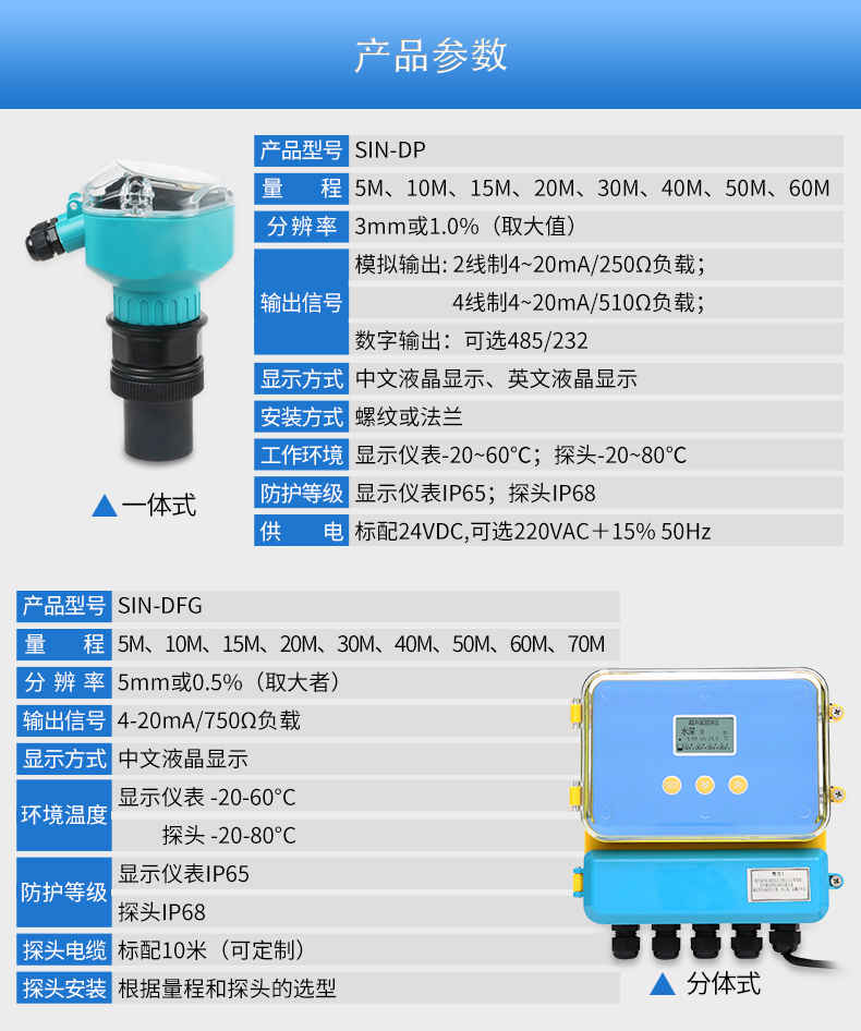 分體式超聲波液位計的原理是測量一個超聲波脈沖從發出到返回整個過程所需的時間。超聲波液位計垂直安裝在液體的表面,它向液面發出一個超聲波脈沖,經過一段時間,超聲波液位計的傳感器接收到從液面反射回的信號,信號經過變送器電路的選擇和處理,根據超聲波液位計發出和接收超聲波的時間差,計算出液面到傳感器的距離。分體式超聲波液位計廣泛用于罐體、水池、水庫的液位和體積測量,也可用于明渠的流量測量。